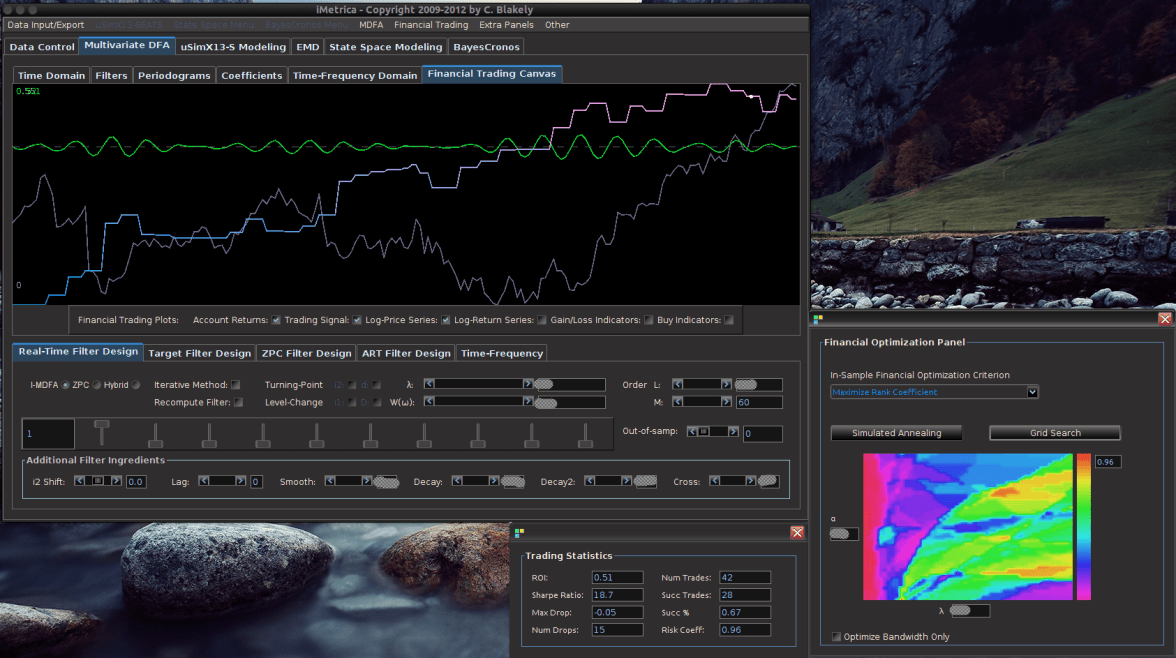 After in-sample optimization on both the customization and filter frequency band. The trading signal in-sample yields a 51 percent ROI and a rank coefficient of .96. The trading statistics panel are just below the main interface and the optimization panel showing the values of the rank coefficient for a grid of customization parameters.