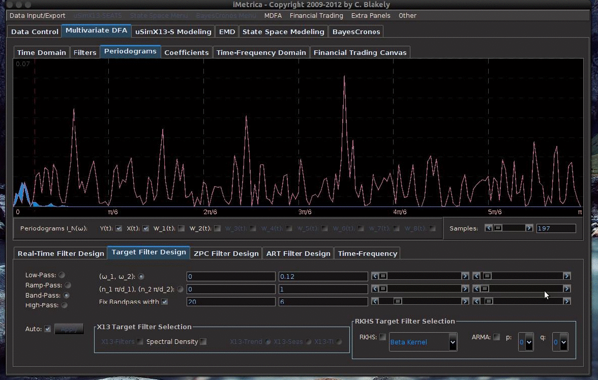 The periodogram of the daily log-returns of GOOG. We fix a band-width of length .12 and sweep it accross the frequency range from [0,.12] all the way to [2.35,2.47], where the, periodogram of the output signal is compared to that or the original data. The difference is shaded in light blue. Optmal ranges for building trading signal are found near the spectral peaks of the periodogram between \pi/6 and 3\pi/6. The performance of these corresponding frequency intervals are found in the animation below.