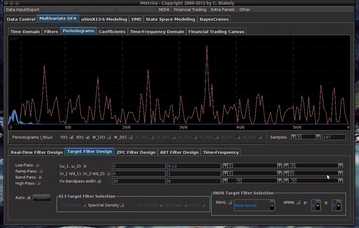 The periodogram of the daily log-returns of GOOG. We fix a band-width of length .12 and sweep it accross the frequency range from [0,.12] all the way to [2.35,2.47], where the, periodogram of the output signal is compared to that or the original data. The difference is shaded in light blue. Optmal ranges for building trading signal are found near the spectral peaks of the periodogram between \pi/6 and 3\pi/6. The performance of these corresponding frequency intervals are found in the animation below.