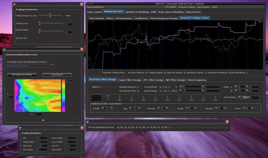 I realize that I’ve been MIA (missing in action for non-anglophones) the past three months on this blog, but I assure you there has been good reason for my long absence. Not only have I developed a large slew of various optimization, analysis, and statistical tools in iMetrica for constructing high-performance financial trading signals geared towards intraday trading which I will (slowly) be sharing over the next several months (with some of the secret-sauce-recipes kept to myself and my current clients of course), but I have also built, engineered, tested, and finally put into commission on a daily basis the planet’s first automated financial trading platform completely based on the recently developed FT-AMDFA (adaptive multivariate direct filtering approach for financial trading). I introduce to you iMetrica’s little sister, TWS-iMetrica.