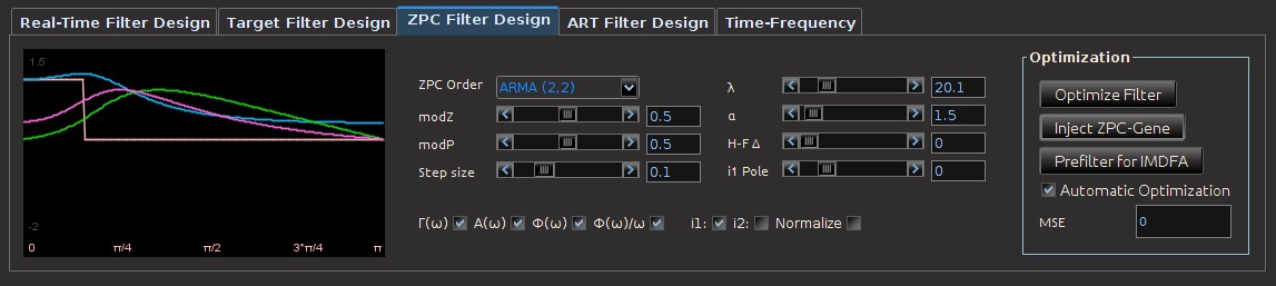 Figure 2: The iMetrica MDFA module for constructing the trading filters. Features dozens of design, analysis, and optimization components to fit the trading priorities of the user and is used in conjunction with the TWS-iMetrica interface.