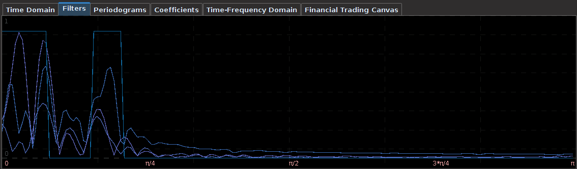 The coefficients for the TM and DIG series depicted in Figure 12 show the heavy amount of smooth and decay (and decay2) regularization, a trio of parameters that was not easy to pinpoint at first without significant leakage above one in the filter transfer functions (shown in Figure 13). One can see that two major spectral peaks are present under the lowpass portion and another large one in the bandpass portion that accounts for the more frequent trades.